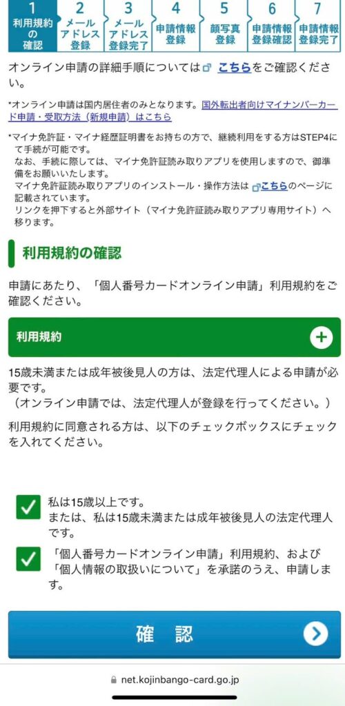 Ở phần 利用規約確認, tích chọn vào cả hai ô vuông để đồng ý điều khoản. Sau đó nhấn「確認」 để sang bước tiếp theo theo.