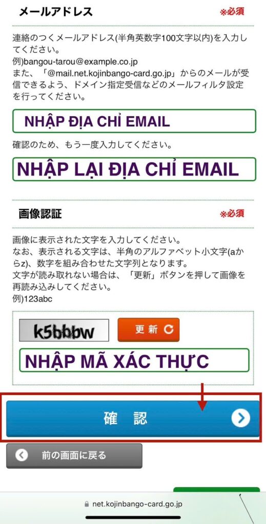 - Trong ô 「画像認証」, nhập mã hiển thị trên hình rồi bấm nút 「確認」 để tiếp tục.