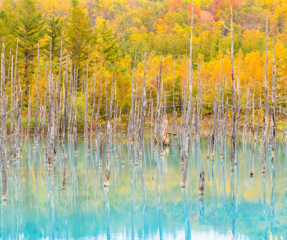 Ao Xanh là điểm check-in nổi tiếng ở thị trấn Biei. Mặt nước màu xanh ngọc bích trong veo, khi được bao quanh bởi rừng phong vàng đỏ vào mùa thu, tạo nên khung cảnh tĩnh lặng, nên thơ khó quên.