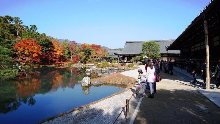 Tenryū-ji nằm trong khu rừng tre Arashiyama, có khu vườn lớn bao quanh hồ. Khi mùa thu đến, những hàng cây soi bóng trên mặt nước tạo nên bức tranh lãng mạn đặc trưng của Kyoto.