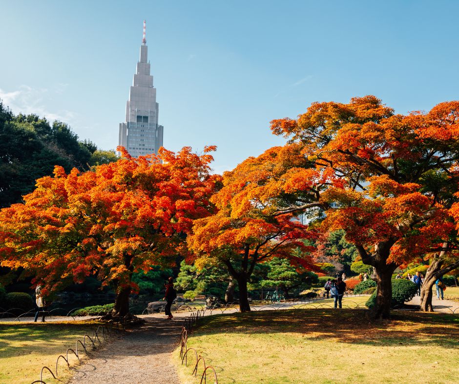 Khu công viên rộng lớn nằm giữa lòng Tokyo này sở hữu cả vườn kiểu Nhật, kiểu Pháp và kiểu Anh. Vào mùa thu, mỗi khu lại khoác một màu khác nhau: đỏ tía, vàng óng, cam rực — tạo nên bức tranh đa sắc tuyệt đẹp.