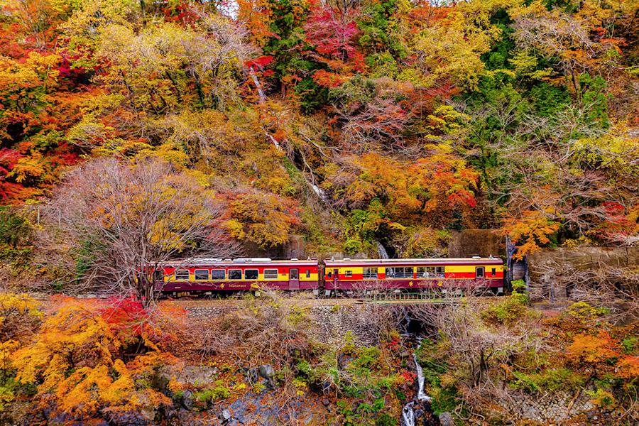 Chuyến tàu nhỏ băng qua những hẻm núi rực rỡ sắc thu là trải nghiệm được nhiều người Nhật yêu thích. Ngồi trên toa tàu gỗ cổ điển, bạn sẽ thấy những hàng cây ven sông đua nhau chuyển màu, trải dài như dải lụa đỏ vàng bên đường ray.