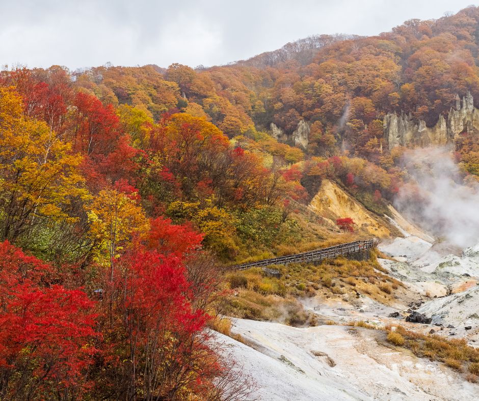 Thung lũng Jigokudani nằm gần khu suối nóng Noboribetsu. Những dòng khói trắng bốc lên từ lòng đất tạo nên khung cảnh siêu thực, và khi lá rừng xung quanh đổi sắc đỏ vàng, cả thung lũng trở nên kỳ ảo như bước ra từ tranh thủy mặc.